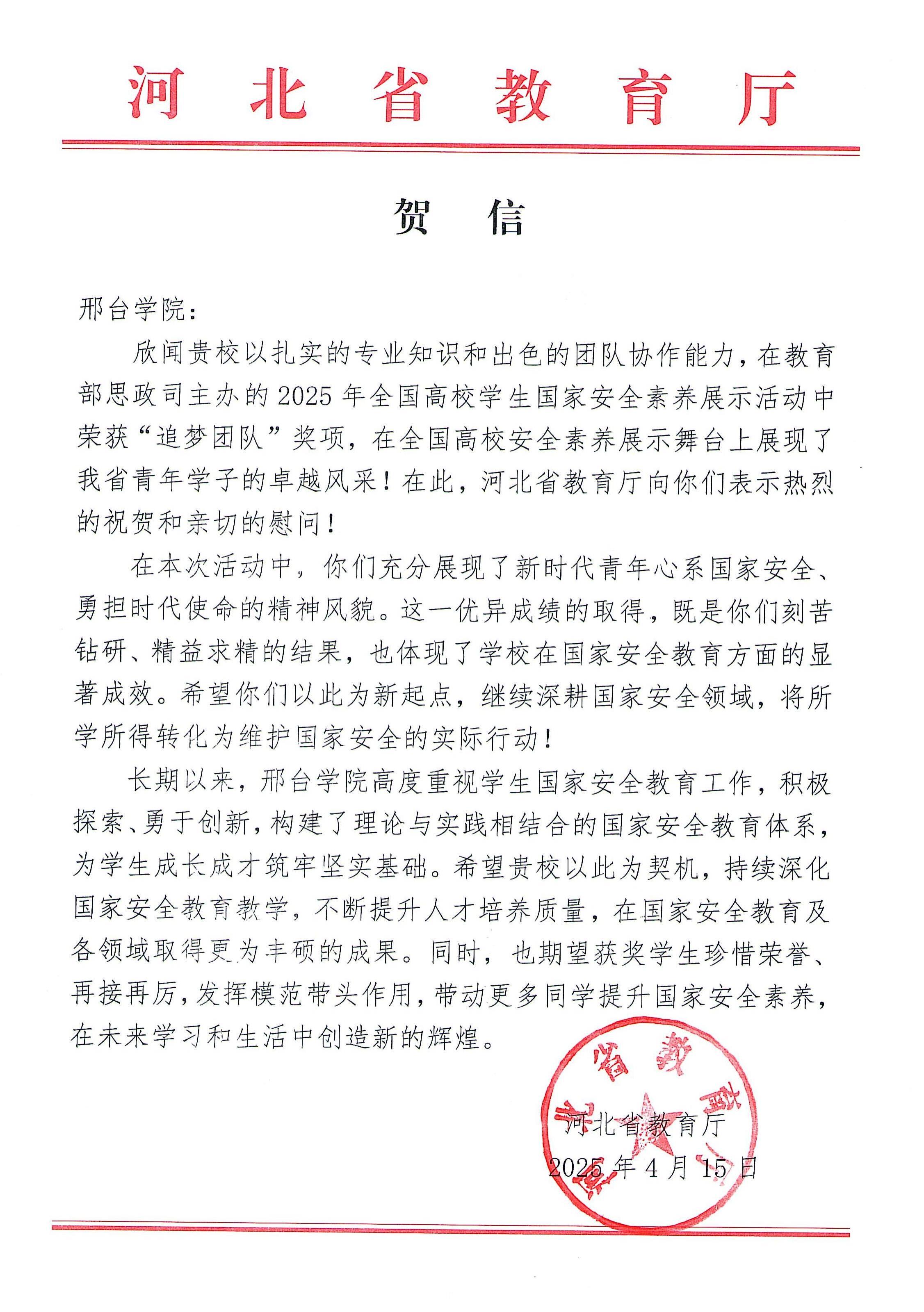 省教育厅致贺信对我校取得优异成绩表示祝贺。贺信中指出,邢台学院高度重视学生国家安全教育工作,积极探索、勇于创新,构建理论与实践相结合的国家安全教育体系,为学生成长成才筑牢坚实基础。活动中邢台学院青年学生充分展示了心系国家安全、勇担时代使命的精神风貌。希望邢台学院青年学生以此为新起点,继续深耕国家安全领域,将所学所得转化为维护国家安全的实际行动。希望邢台学院以此为契机持续深化国家安全教育教学,不断提升人才培养质量,在国家安全教育及各领域取得更为丰硕的成果。